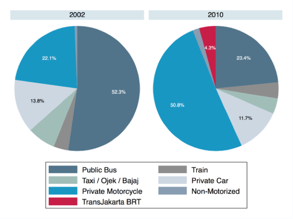 Instead, we find that throughout Jakarta, there was a substantial increase in motorcycle ownership and car ownership between 2002 and 2010, and a similarly large decrease in the percentage of commuters who used the traditional public bus system.