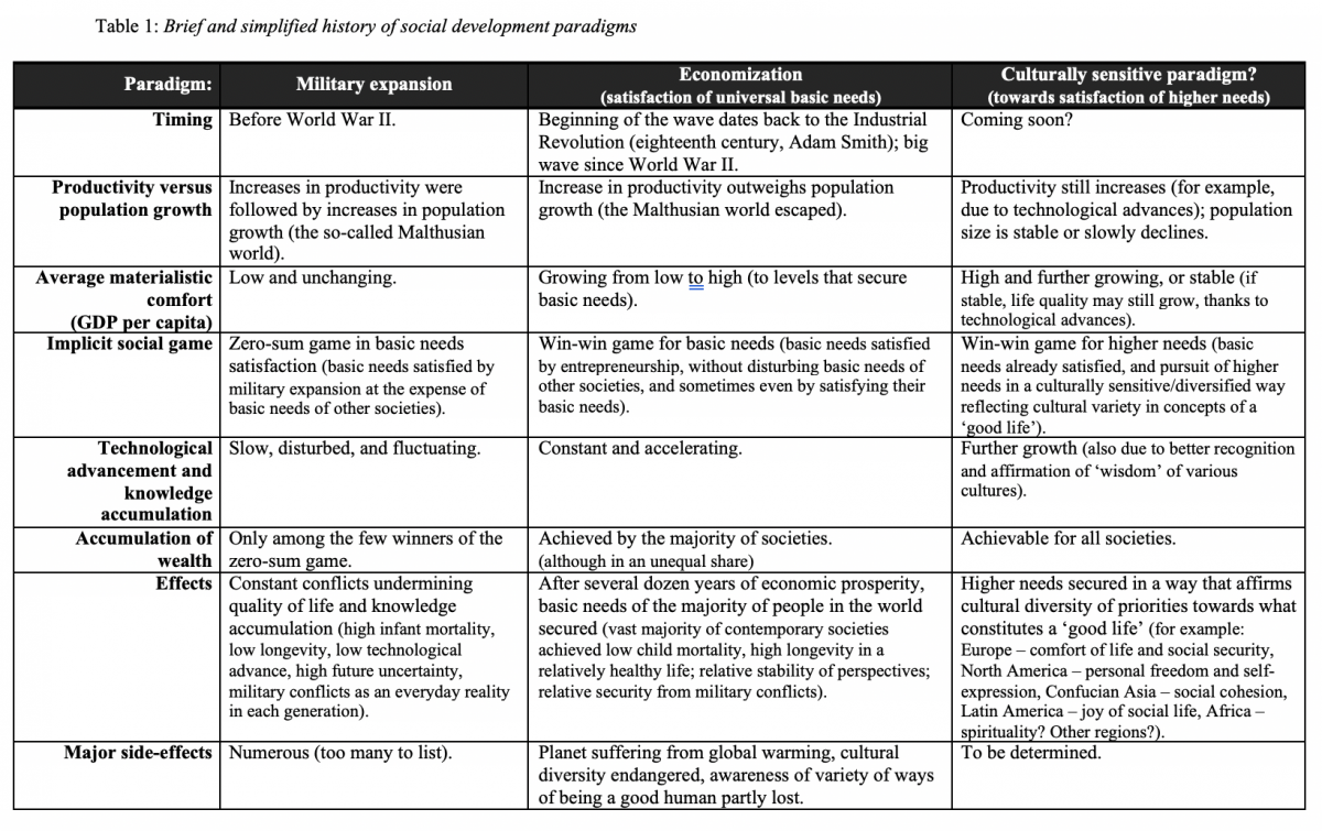 We advocate that the philosophies underlying development indexes should reflect the cultural diversity of contemporary societies in terms of their preferred development goals and the pathways leading to these goals. Table 1 provides a summary comparison of the culturally sensitive paradigm to the economic paradigm (and to the previously dominant military paradigm).