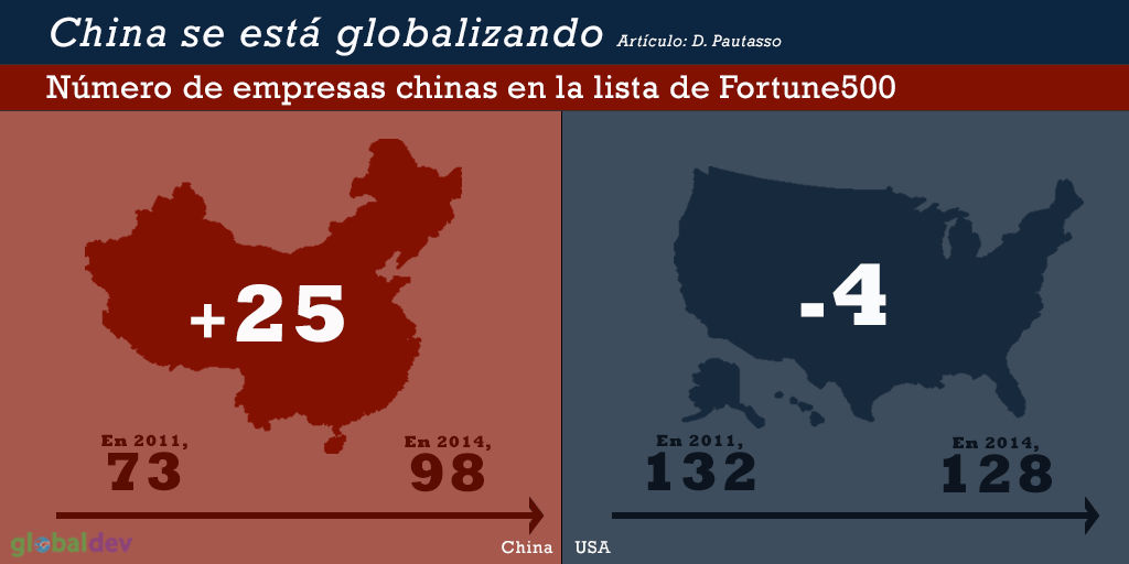 En efecto, China se está convirtiendo en la principal fuente de inversión extranjera directa en el mundo, lo cual es impulsado en gran medida por las empresas estatales que actúan en consonancia con los intereses del gobierno. No es coincidencia que el número de empresas chinas en la lista de Fortune 500 se ha incrementado exponencialmente: en la clasificación de 2014, ya había 95 empresas chinas (incluyendo Hong Kong), mientras que la participación de las de Estados Unidos disminuyó de 132 a 128.