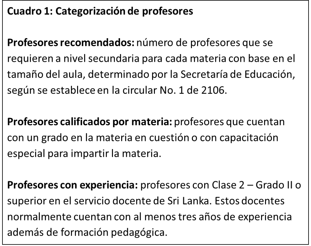 En Sri Lanka, las oportunidades limitadas de formación docente constituyen una razón importante detrás de la escasez de profesores calificados y con experiencia. Dicha capacitación está disponible por dos vías: una Licenciatura en Educación (BEd), ofrecida por las facultades universitarias y por los departamentos de educación; y un Diploma Nacional de Enseñanza (NDT) de tres años que ofrecen los Colegios Nacionales de Educación (NCOEs).