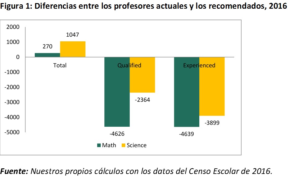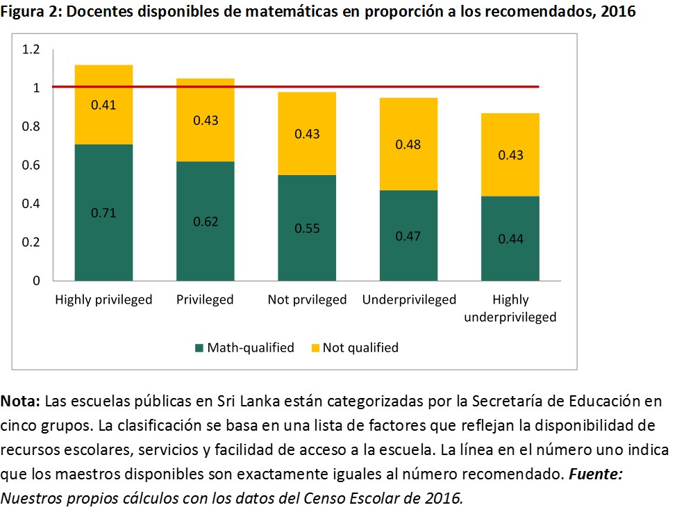 Nuestra investigación muestra que, entre otros factores, las escuelas de Sri Lanka que tienen un mayor porcentaje de profesores de matemáticas calificados y con experiencia, reportan mejores resultados en los exámenes de Nivel O. También encontramos que, si bien el país no tiene una escasez general de profesores de matemáticas y ciencias, en estas áreas existe un déficit significativo de docentes calificados y con experiencia (Figura 1). Esto es motivo de profunda preocupación, particularmente a la luz del objetivo de Sri Lanka de mejorar la educación en ciencia, tecnología, ingeniería y matemáticas (STEM).