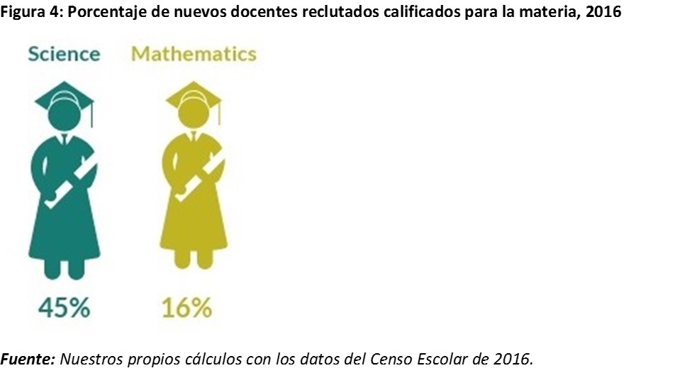 La Figura 3 también muestra que el reclutamiento no se lleva a cabo de manera sistemática, de hecho, se contratan grandes cantidades de maestros en algunos años y pocos en otros. Además, los contratos rara vez coinciden con la formación de los profesores. Del número total de docentes que se unieron al servicio de docentes en 2016, solo una fracción estaba calificada para la materia para la que fue contratada – ver Figura 4.