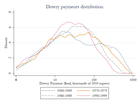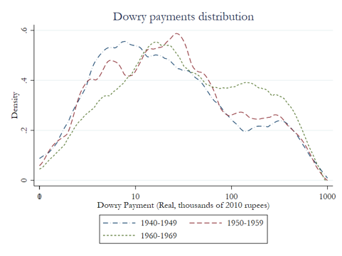 As Figure 1a shows, there was an increase in dowry payments across the distribution between 1940 and 1970, a phenomenon labeled by previous researchers as ‘dowry inflation’. During this time, individuals from all socio-economic groups experienced a rise in dowry amounts.