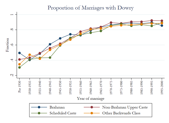 Figure 2 shows that this theory cannot explain the rise of dowry. Both low- and high-caste groups began wide-scale adoption of dowry at around the same time and rates. This has bearing for policies, for example, that could focus on changing norms among higher status individuals and shows that this is not the case.