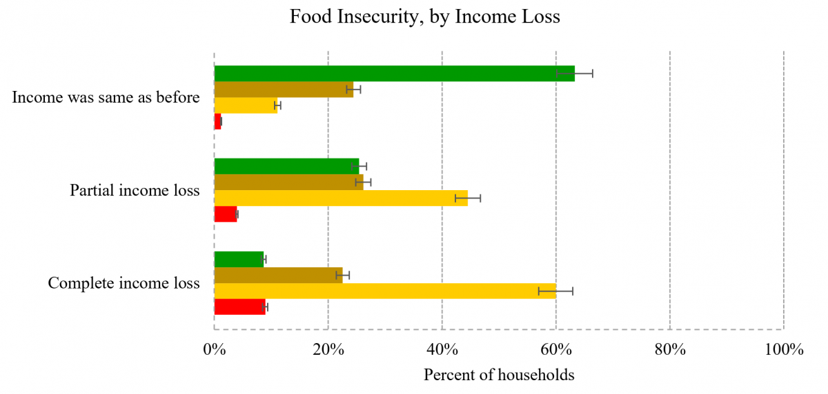 Los hallazgos muestran que las familias cuyos ingresos no han cambiado, tienen en su mayoría garantizados sus alimentos, pero la inseguridad alimentaria parece aumentar con la pérdida de ingresos (ver Figura 1). Además, la inseguridad alimentaria de moderada a grave es mayor entre los hogares que experimentaron una pérdida total de ingresos que entre los hogares que solo experimentaron una pérdida parcial de ingresos.