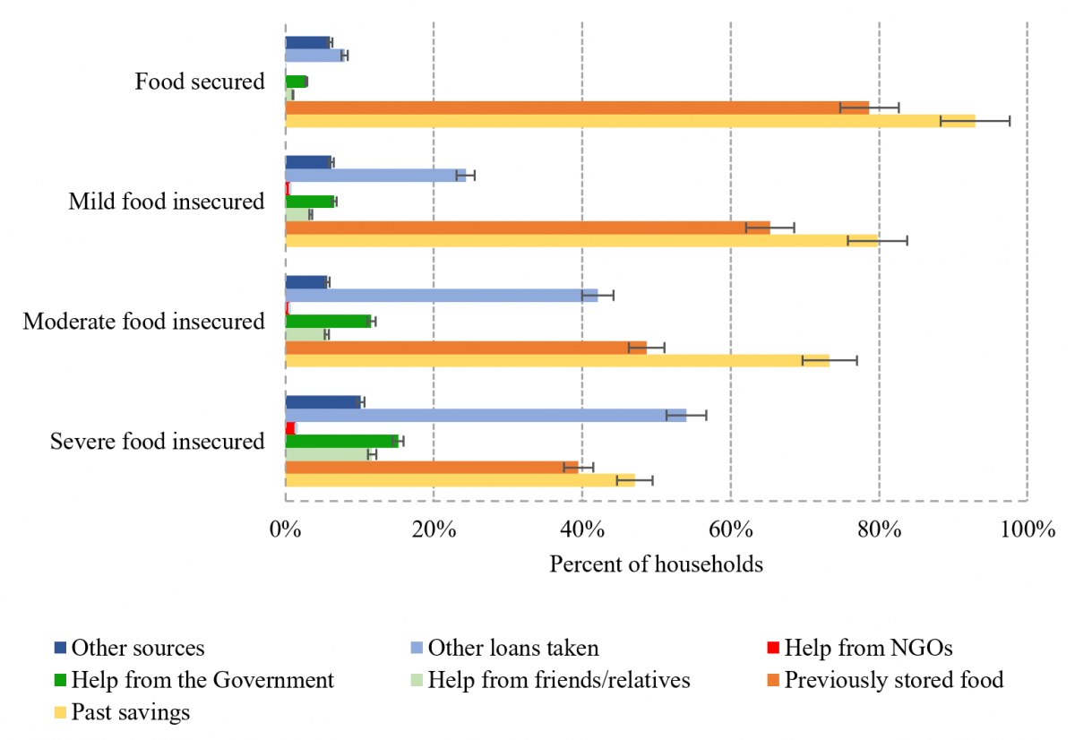 La Figura 2 muestra que las familias dependen principalmente de ahorros anteriores, reservas de alimentos y préstamos para hacer frente a la pérdida de ingresos. En particular, las familias con mayores ahorros y reservas de alimentos tienen una inseguridad alimentaria relativamente menor, y es más probable que soliciten préstamos cuando tienen más inseguridad alimentaria. Además, los préstamos familiares aumentaron para las familias con inseguridad alimentaria severa, que obtuvieron más préstamos que las familias con inseguridad alimentaria leve a moderada. El apoyo del gobierno fue muy bajo.