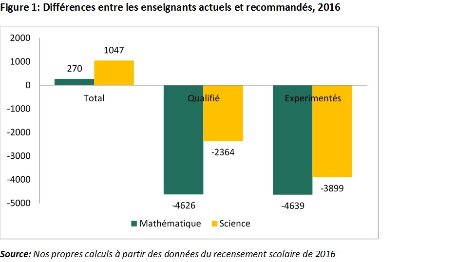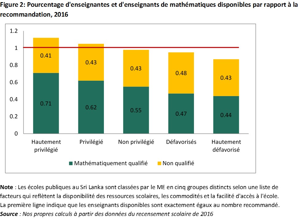 Notre recherche montre que, parmi d'autres facteurs, les écoles sri-lankaises qui ont une plus grande proportion d'enseignants qualifiés et expérimentés en mathématiques rapportent de meilleurs résultats O-Level. Nous constatons également que, même si le pays ne connaît pas de pénurie générale d'enseignants en mathématiques et en sciences, il y a un déficit important d'enseignants qualifiés et expérimentés (figure 1). C'est une source de profonde préoccupation, en particulier à la lumière de l'objectif du Sri Lanka d'améliorer l'éducation des programmes STEM.