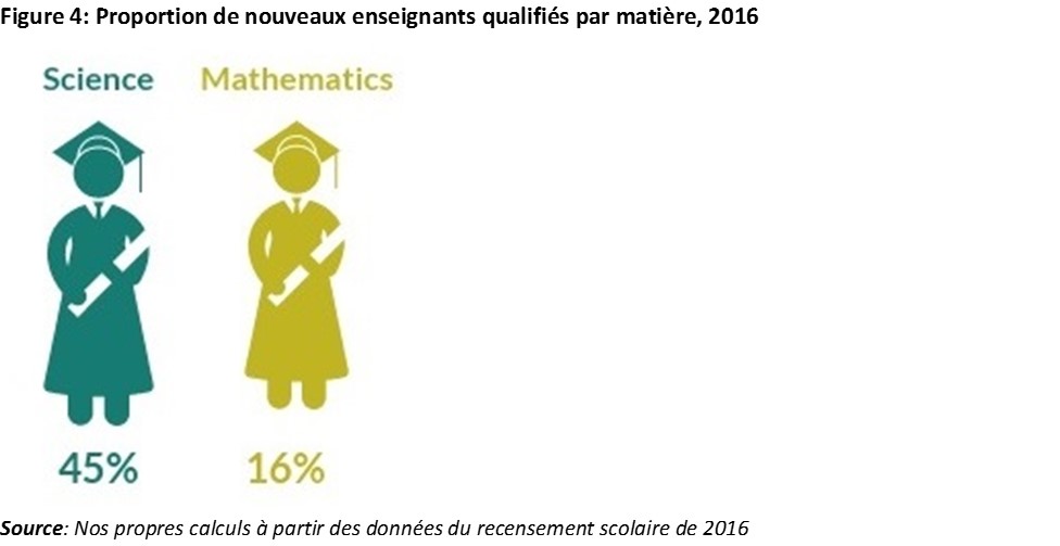 La figure 3 montre également que le recrutement est effectué de manière non systématique, avec un grand nombre d'enseignants recrutés au cours de certaines années et un nombre inférieur dans d'autres. En outre, les enseignants sont rarement bien adaptés à leur éducation et à leur formation lors du recrutement. Sur le nombre total d'enseignantes et d'enseignants qui se sont joints au service de l'enseignement en 2016, seule une fraction était qualifiée pour enseigner une matière - voir la figure 4.