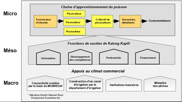La collectivisation des pisciculteurs sous la forme d’organisations de producteurs peut renforcer le pouvoir de négociations de ces mêmes pisciculteurs. Les groupes à responsabilité conjointe et groupes d’entraide qui sont impliqués dans des activités économiques pourraient être transformés en de telles organisations afin de connecter les petits pisciculteurs au crédit, à la technologie et aux marchés. Le soutien des ONG est important pour le renforcement institutionnel et pour développer un modèle d’affaires communautaire.